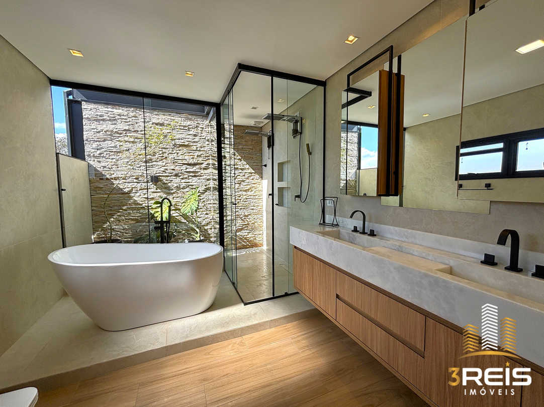 › Banheiro conceito com jardim de inverno, banheira de imersão, duplo chuveiro, box de teto, ralos lineares, cuba dupla esculpida em quartzo e marcenaria planejada