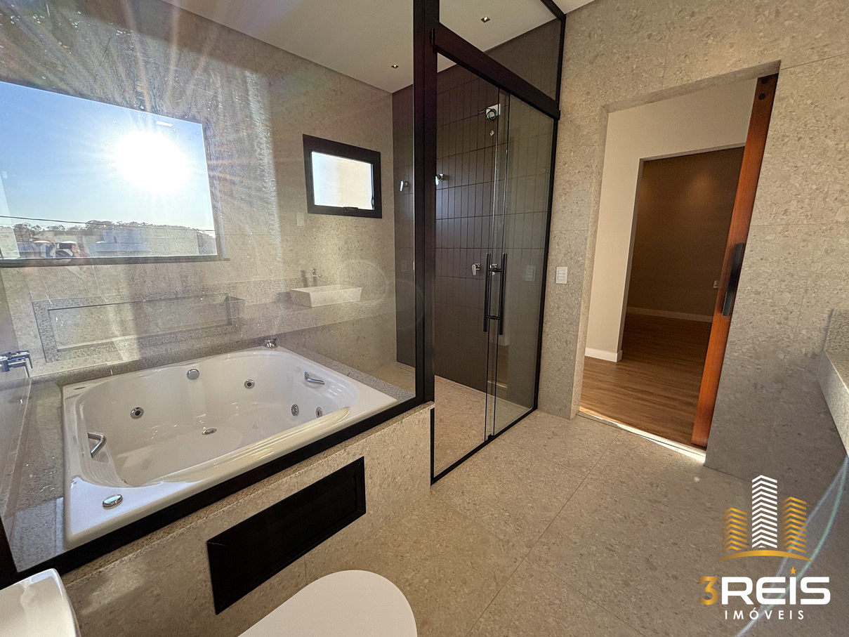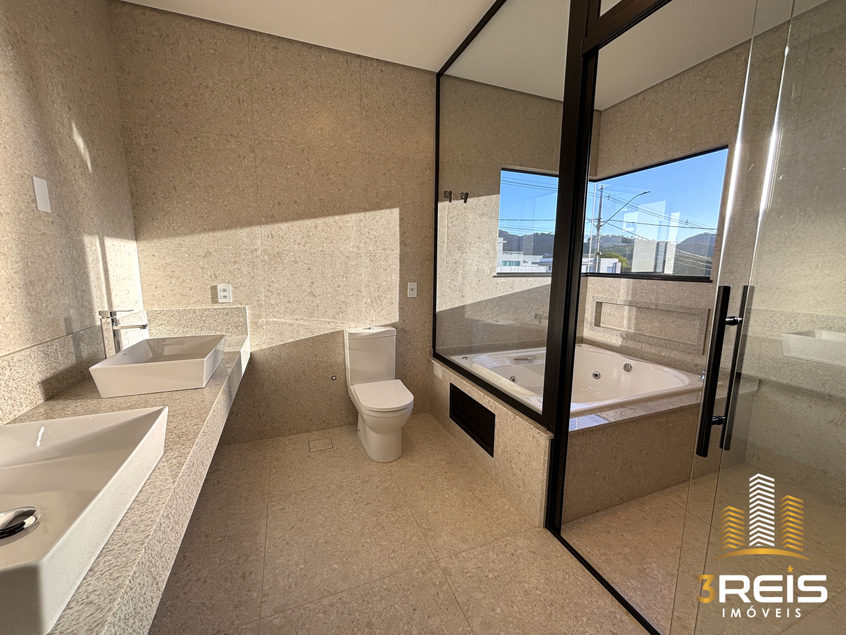 Banheiro com banheira de hidromassagem com nicho e janela com vista para o pôr do sol, pia em granito com cuba dupla e chuveiro duplo com box de vidro e ralo linear.