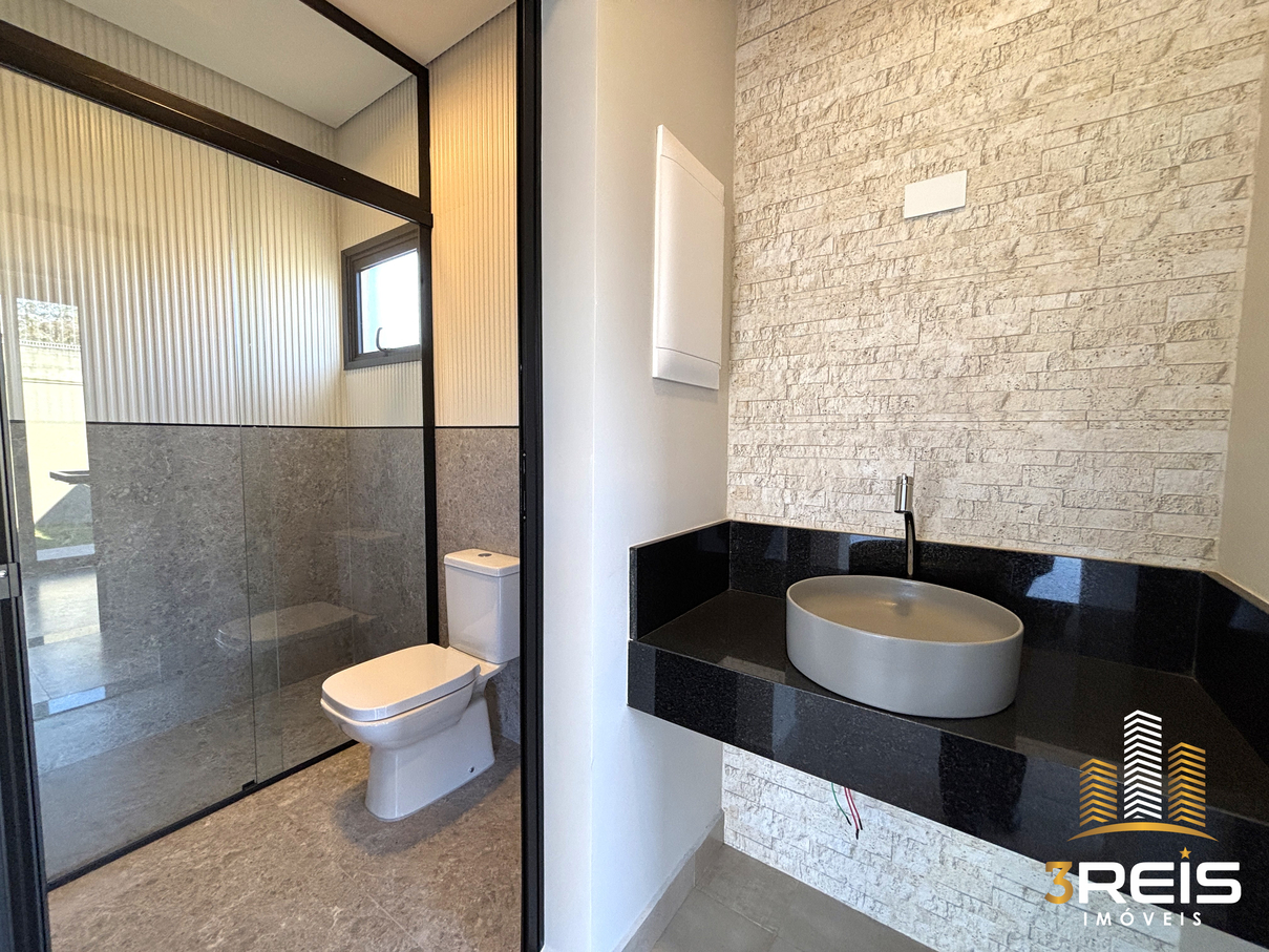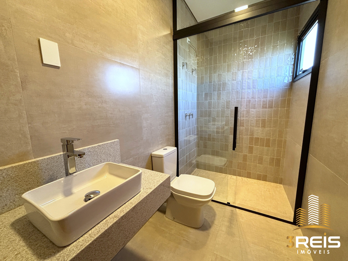 • Banheiro social com pia em granito, box e ralo linear
